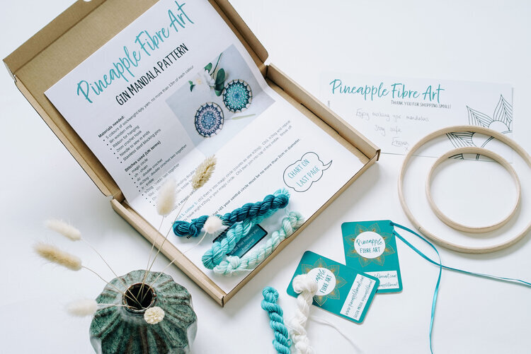 Pineapple Fibre Art started from a love of colour, crochet and intricate vintage doily patterns. Using gorgeously soft hand dyed yarn to make crochet wall art from little 10cm mandalas up to 70cm hoops these old patterns can be enjoyed in a new form. Emma also learnt to design her own patterns and shares them in the form of kits so others can make their own mandalas too.