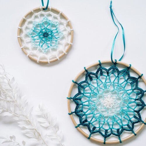 This kit contains yarns, ribbons, hoops and the written patterns and charts to make two mandalas (one 10cm in diameter, one 15cm). All you need is a 2mm crochet hook (or size to obtain gauge), pins to block them out, scissors and a needle to sew in the ends.