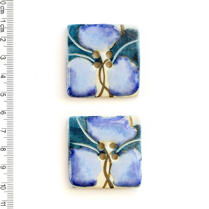 2 large square statement buttons. A beautiful hand-painted blue floral on an extra large square button.