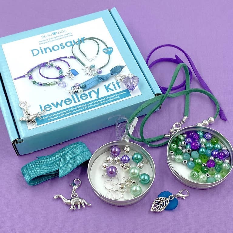 A cute little dinosaur jewellery making kit, full of glass pearls, crystals and seed beads (tiny beads!). Easy to clip on (and swap around) charms include a silver T-Rex Dinosaur, a silver Diplodocus (long neck) Dinosaur, some leaves and a purple heart. This kit makes three different bracelets - an adjustable friendship bracelet, stretchy bracelet and a festival style ribbon wristband. To finish off the kit, it also includes a ribbon necklace! Children from aged 6 years will be able to complete most projects with a little help (if over 8 years, then they'll probably manage everything with no help - perfect for sleepovers and playdates!). No tools required, although you will need a pair of household scissors to snip the ends of the elastic.
