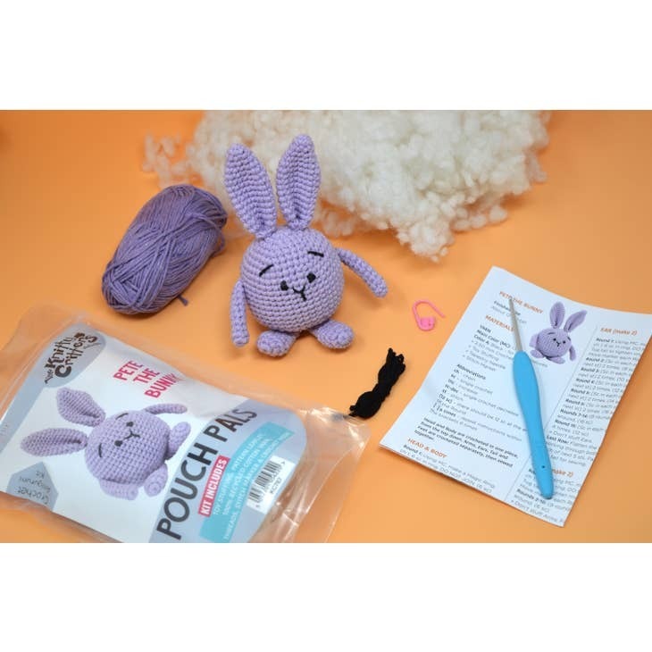 This kit contains everything you need to make your very own amigurumi Pouch Pal - Contents - Toy Stuffing, Pattern Leaflet, 100% Recycled Cotton Yarn, Accessories and Crochet Hook.
