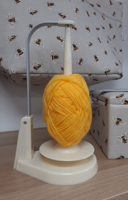 Place your ball of yarn on the yarn holder spindle & with a magnetic pointer it will dangle freely allowing you to knit or crochet easily as the Wool Jeanie gently spins.