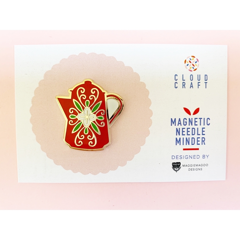 Designed for us by MaggieMagoo Designs, this coloured enamel coffe pot-shaped magnetic needle minder is beautiful quality and very collectable.