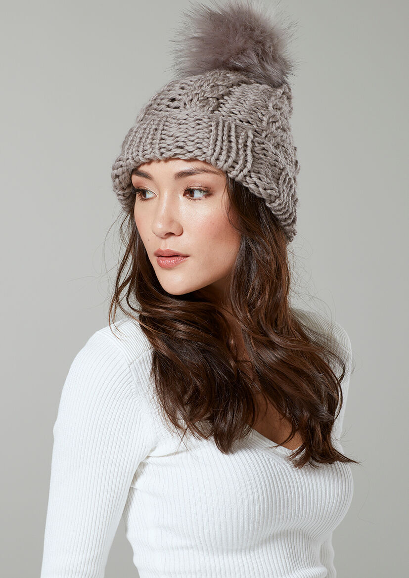 This lovely hat features a simple cable pattern and is finished with a pompom. It was designed by Quail Studio and is knitted in one shade of Big Wool, a 100% wool yarn.